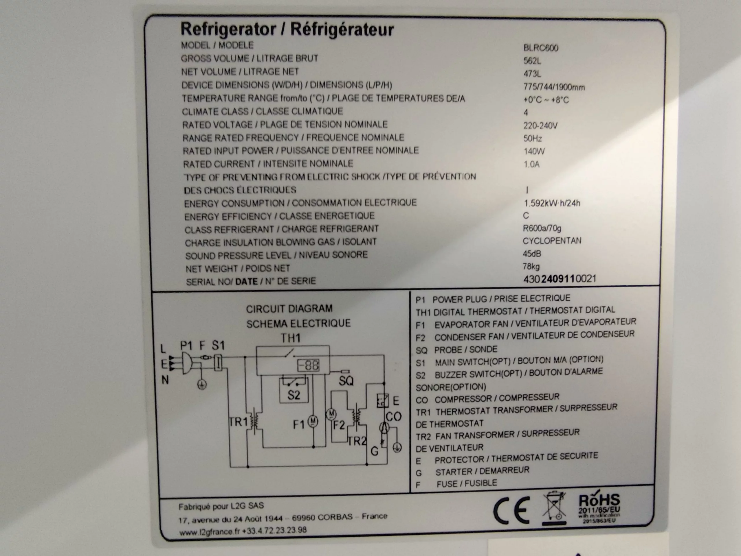 Autres Réfrigération par air brassé 0°C / +8°C / Revêtement extérieur acier laqué noir / Revêtement intérieur en HIPS blanc résistant aux chocs / Fermeture à clé / Capacité : 562 litres  / Dégivrage automatique / Régulation électronique / Fluide frigorigène : R600a / Puissance : 0,14kW / Dotation : 4 clayettes réglables en hauteur 668x525mm + 1 étagère de fond de cuve 668x210mm.
